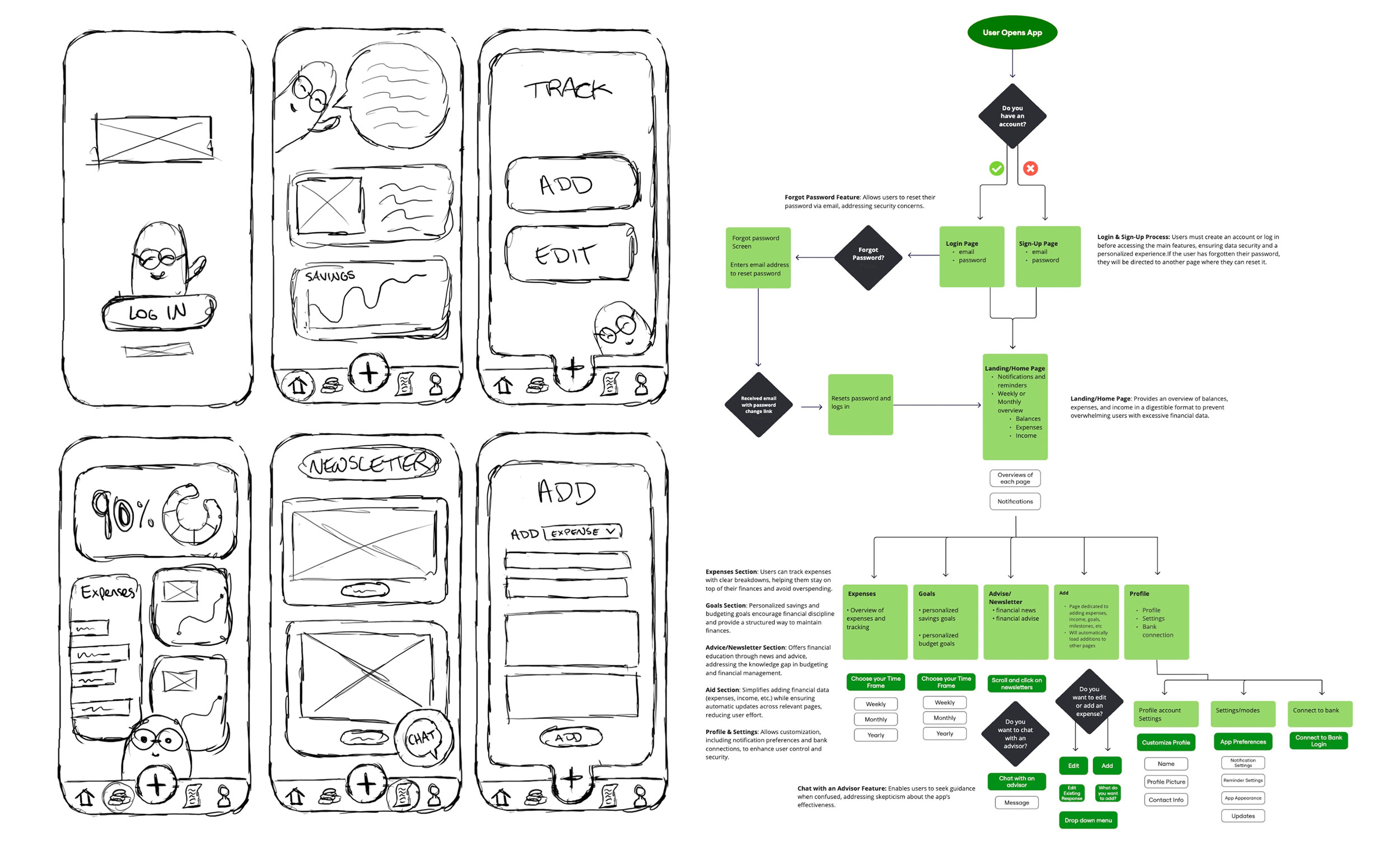 Our goal was to create a tool that felt less like a banking app and more like a friendly coach - reliable, encouraging, and easy to understand. The brand is rooted in ideas of growth, energy, and optimism, which come through in both the tone and visual design. We used a fresh green palette to signify progress and clarity, while our cheerful mascot, Ched, a bright orange character, guides users through the app and adds personality at every step.